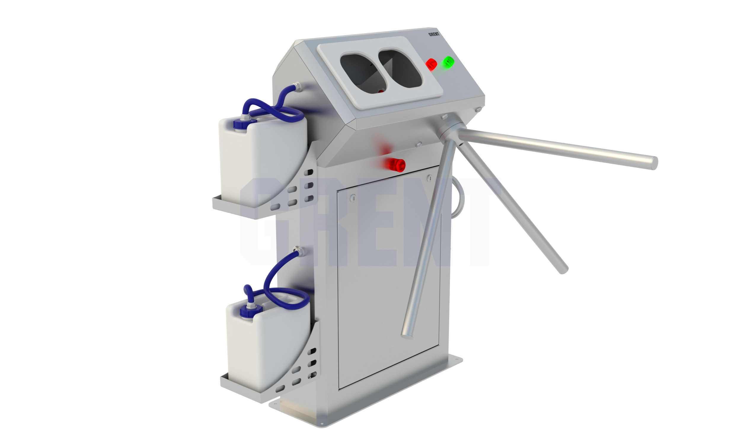 Станция гигиены рук GRENT 012 R предназначена для автоматической бесконтактной дезинфекции кистей рук персонала перед входом в чистую зону. Включение подачи дезинфицирующего средства происходит при поднесении обеих рук в зону срабатывания фотоэлементов, расположенных в дезинфицирующей камере. Дезинфицирующее средство подается автоматически при помощи электронасоса. Распыление дезсредства осуществляют 4 форсунки, расположенные в верхней и нижней части дезинфицирующей камеры, что обеспечивает обработку рук с двух сторон