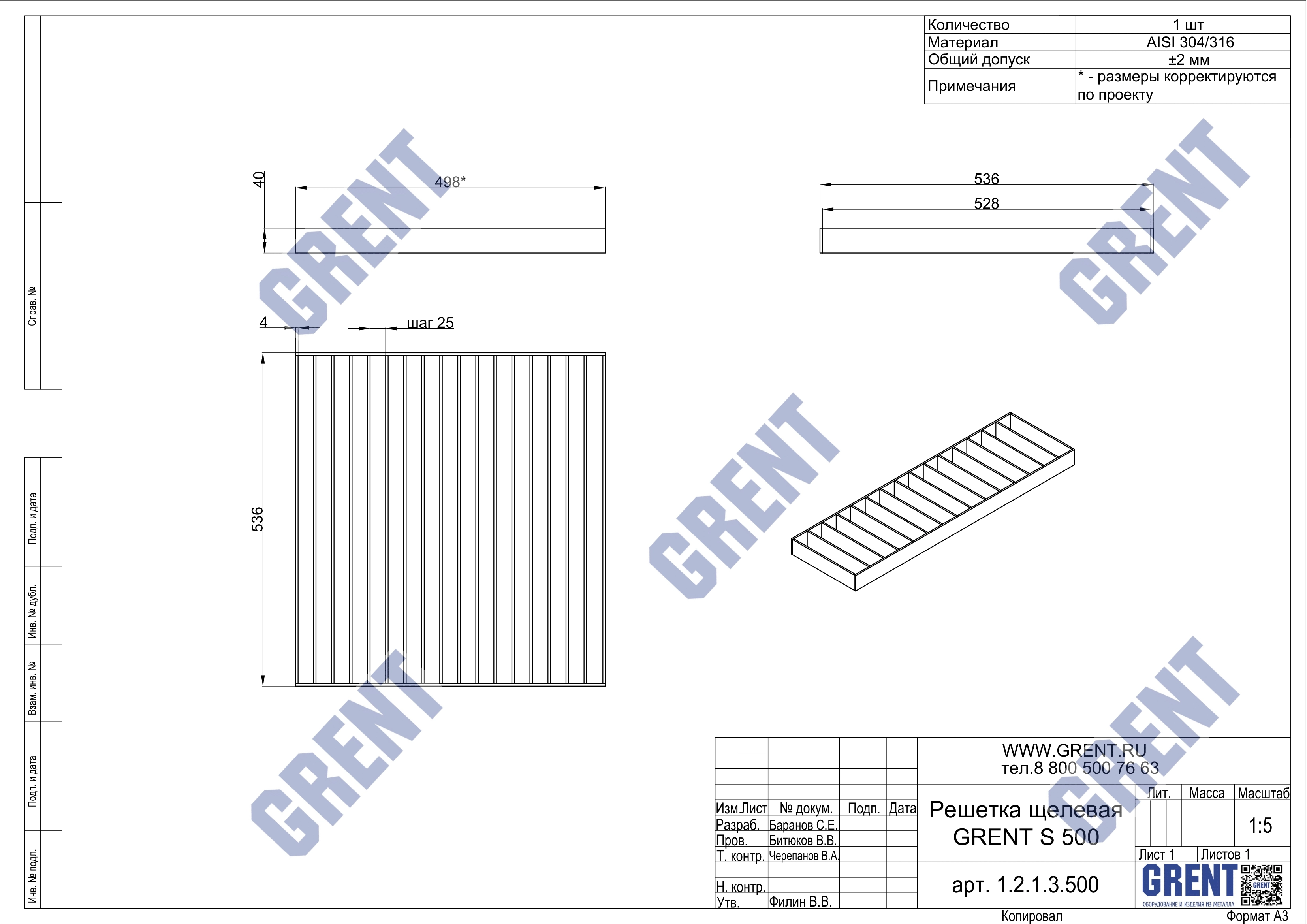Гидравлическое сечение – 500 мм.Материал – нержавеющая сталь AISI 304 / AISI 316